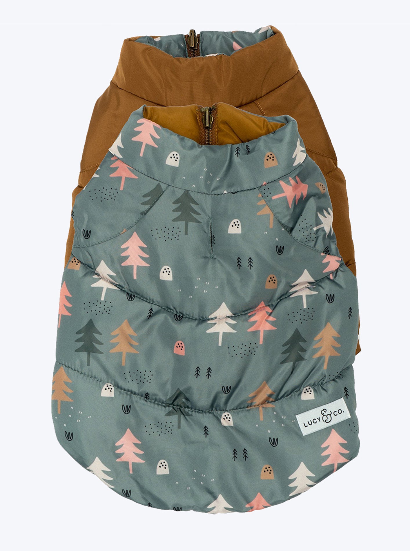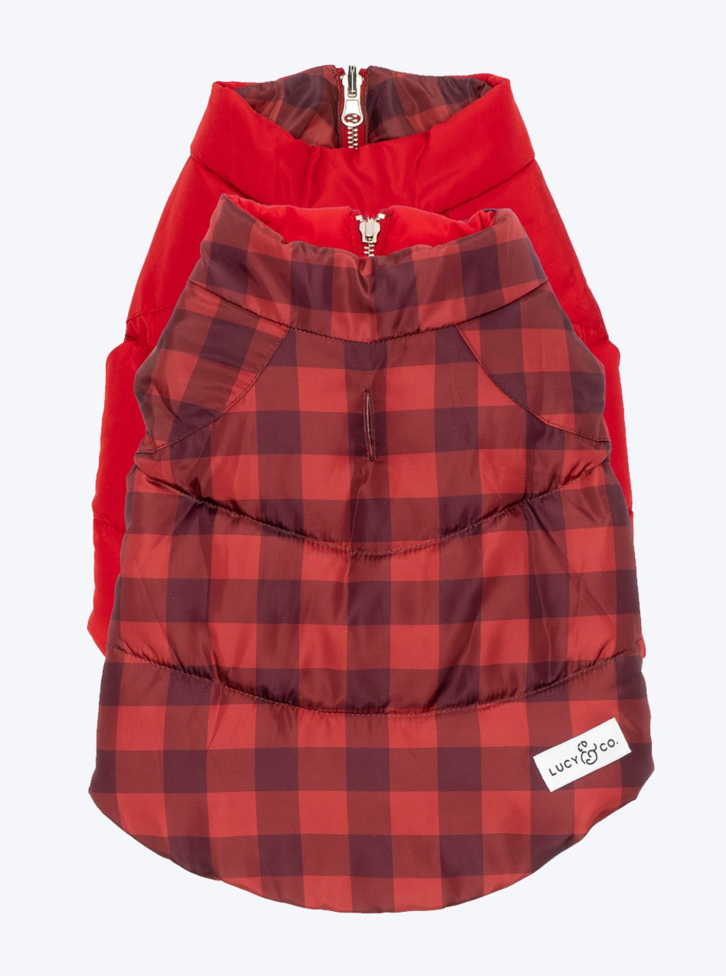 What’s better than ONE rescue dog?  TWO rescue dogs!  What’s better than one outrageously adorable and incredibly warm puffer vest?  [CAUTION:  Our answer may shock and surprise you!]  ONE PUFFER VEST!  Actually, one REVERSIBLE puffer vest from Lucy & Co.