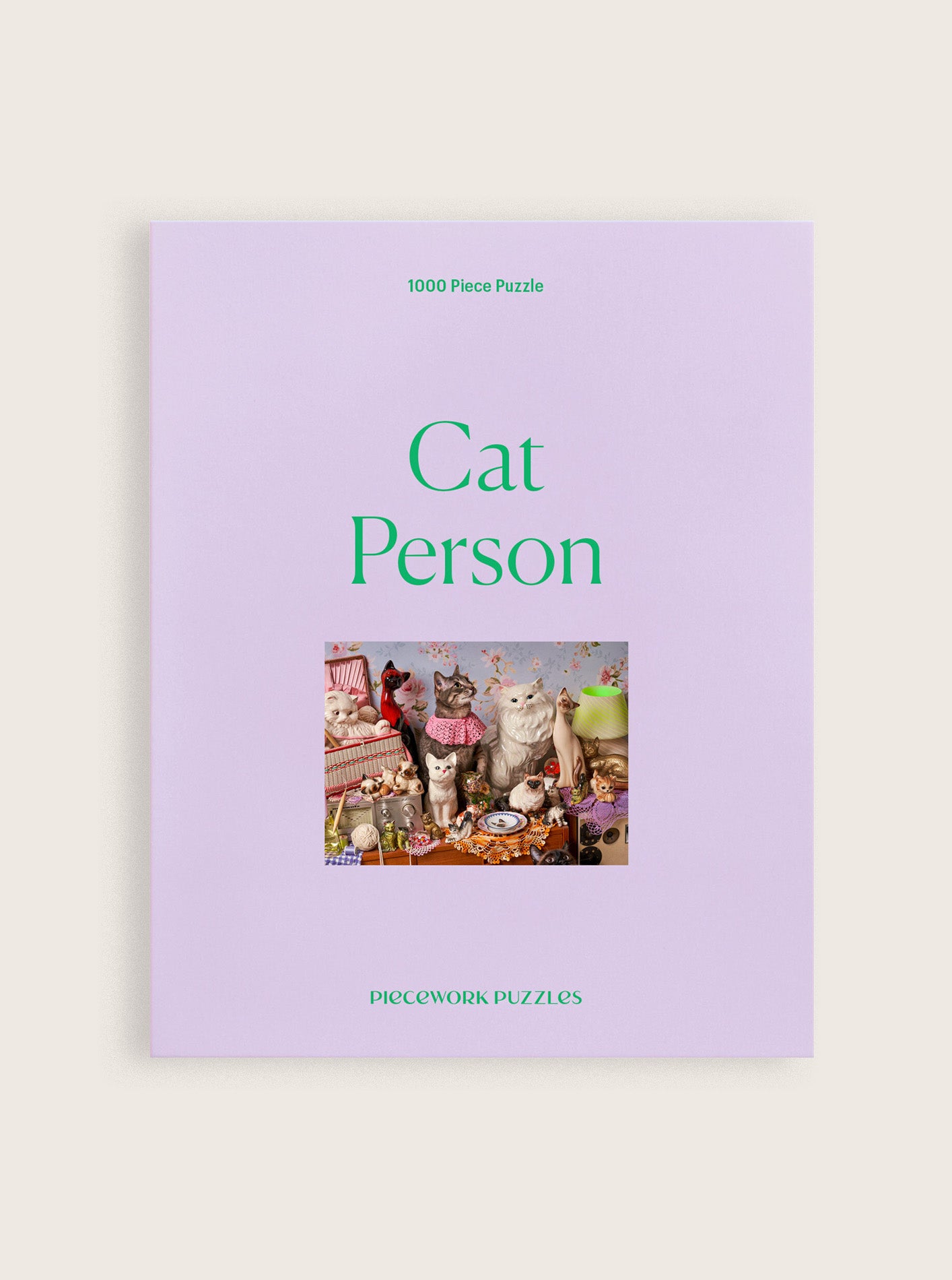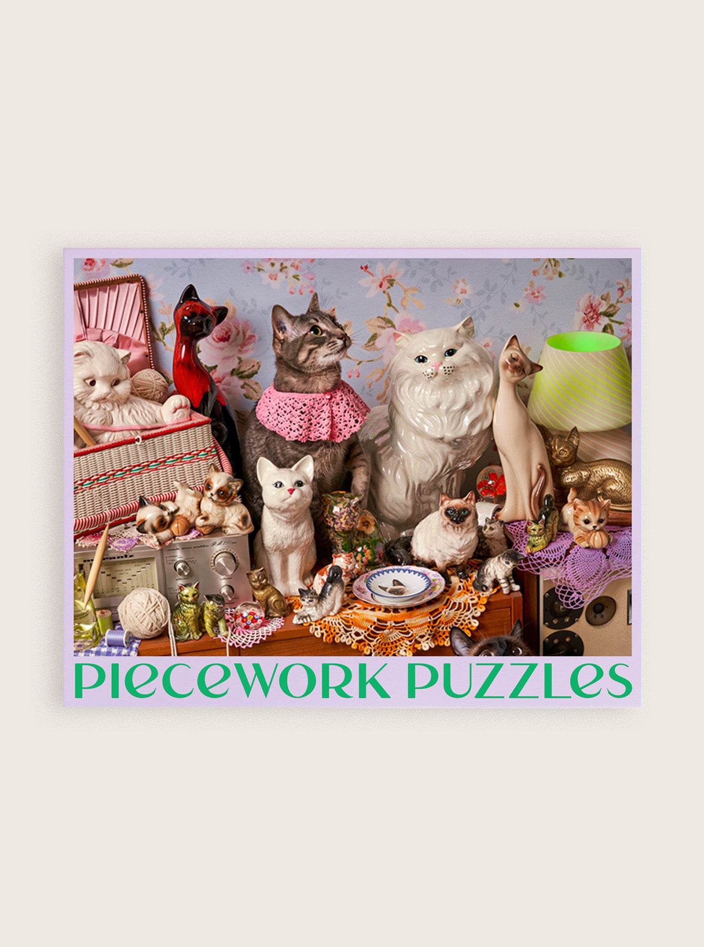 Look at what the cat dragged in. This CAT PERSON 1000 PIECE PUZZLE features 22 curious kitties, two feline friends front and center, and a delightful spread of charming tchotchkes. Playful, detailed, and full of personality, it is truly the cat’s pajamas.