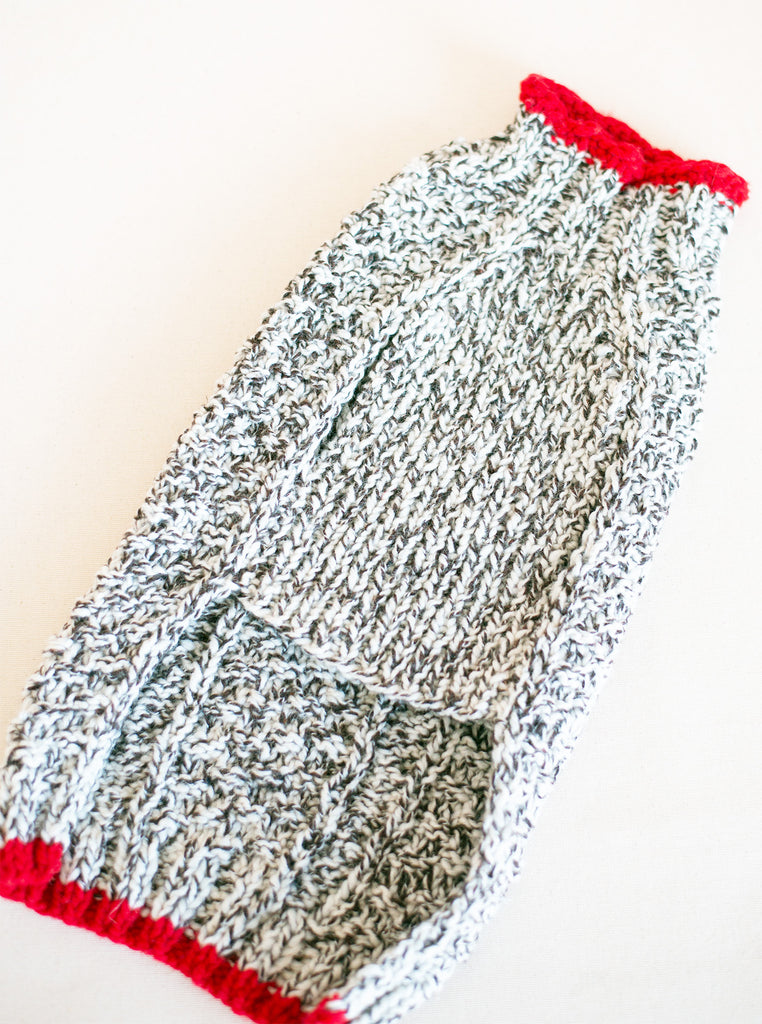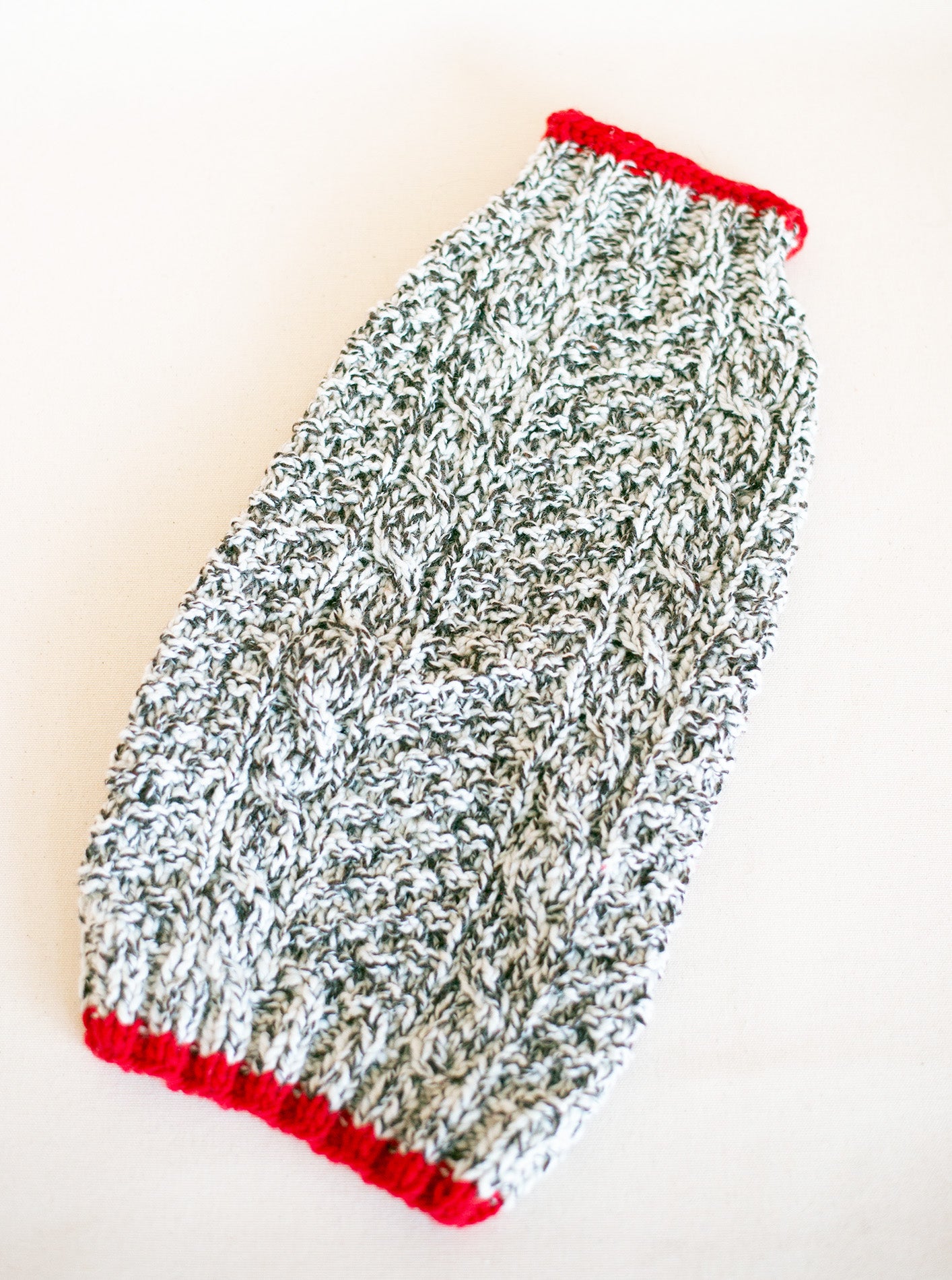 The Oatmeal Cable Knit dog sweater design was inspired from the beautiful colors of oatmeal and red trim.