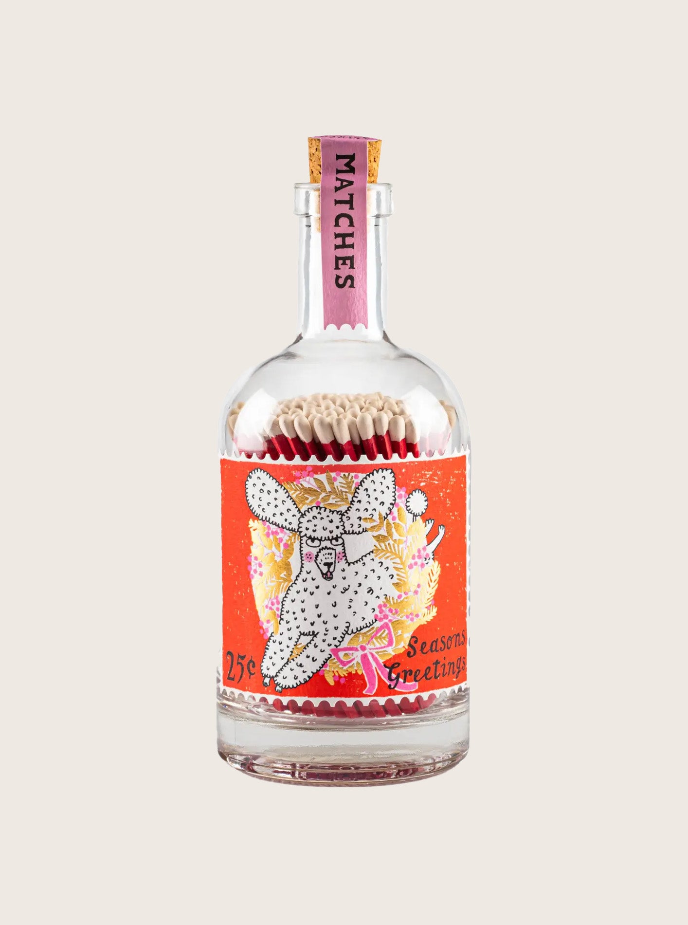 Our match bottle featuring our vintage stamp inspired label showing a white poodle jumping through a wreath of gold foil leaves and pink berries with the words 'Seasons Greetings'